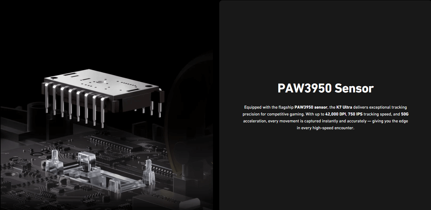 Chuột Mchose K7 Ultra được trang bị cảm biến quang học PAW3950 đỉnh cao, hỗ trợ lên tới 42.000 DPI, tốc độ theo dõi 750 IPS cùng gia tốc 50G—đảm bảo độ chính xác tuyệt đối, phản hồi cực nhanh và khả năng bám chuột siêu mượt trên mọi bề mặt, kể cả pad thủy tinh cao cấp