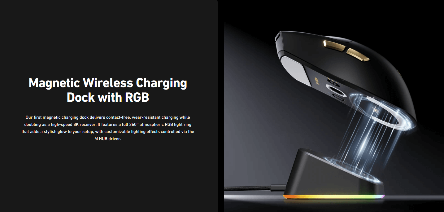 Pin tích hợp lớn 500 mAh, mang lại thời gian chơi lên tới 120 giờ ở chế độ 2.4 GHz. Đi kèm là đế sạc từ tính kiêm receiver 8K, hỗ trợ sạc nhanh và tạo điểm nhấn ánh sáng RGB sinh động